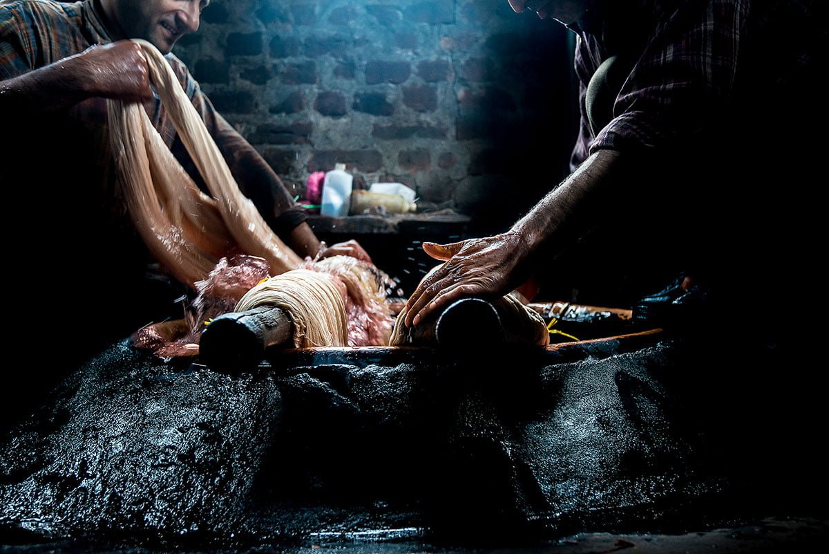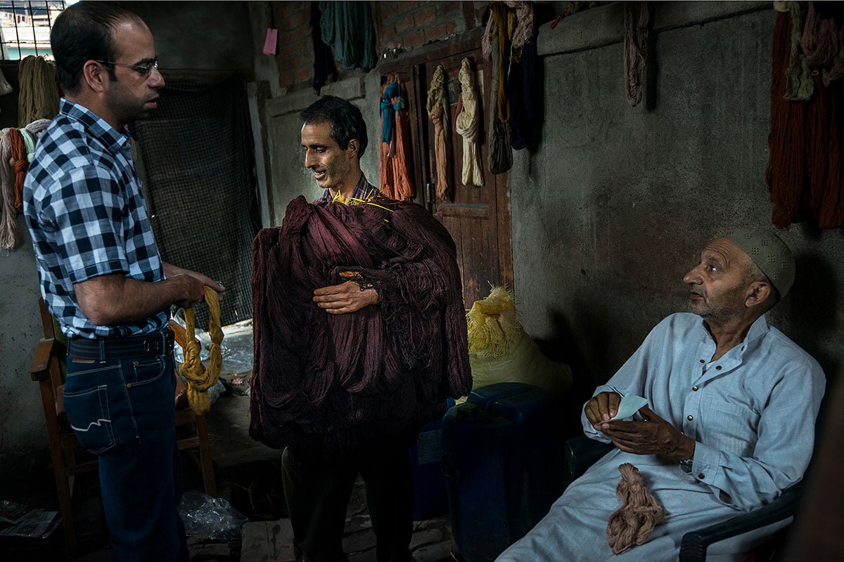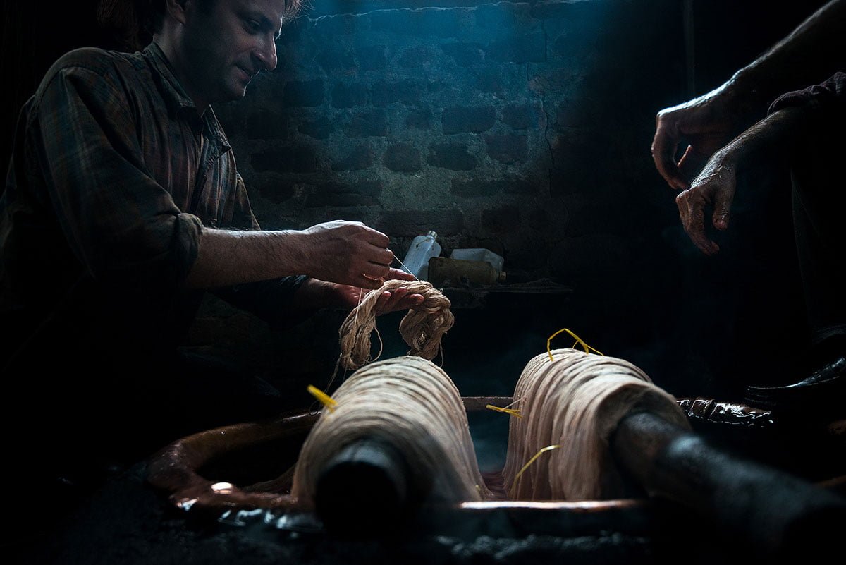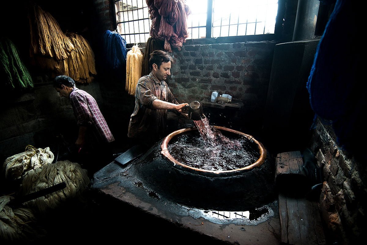 After the cleaning is done, Naushad mixes powdered colours in water heated in an ancient copper urn. The colour is sprinkled, bit by bit, with care and precision, for the water to take in the dye evenly. Then the yarn is wrapped around thick wooden sticks, dipped and rolled gently in the hot water, for the dye to spread uniformly. This takes hours. This is when the yarn gets transformed from within, and such deep transformations cannot be rushed. Once the dyeing is complete, Naushad takes out a thread and dries it over the fire, to test the colour. Then he shows it to Abdul Rashid for approval. If the father and son are satisfied, the process is complete. If not, corrections are made, by giving the yarn more time, more pigments, or some bleach.